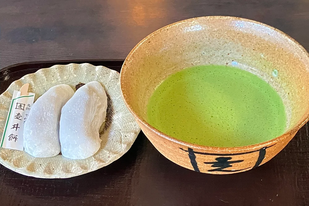 お店が、現在の場所に移転したのは明治時代の頃。その後今日まで刀の荒身を模した「走井餅」や「鳩もなか」などの和菓子を販売し続けています。また、店内でも出来立てのお餅 と抹茶をお召し上がりいただけ、参拝帰りのひと休みとして人気です。